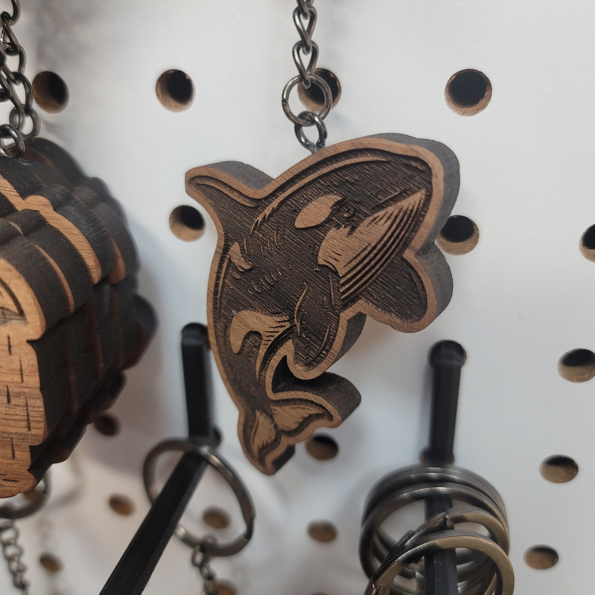 Handcrafted from solid walnut, these unique keychains are designed and made in-house on Vancouver Island. Each keychain averages 2–3 inches in size, featuring art inspired by the West Coast. Durable, lightweight, and engraved for a clean, lasting finish.