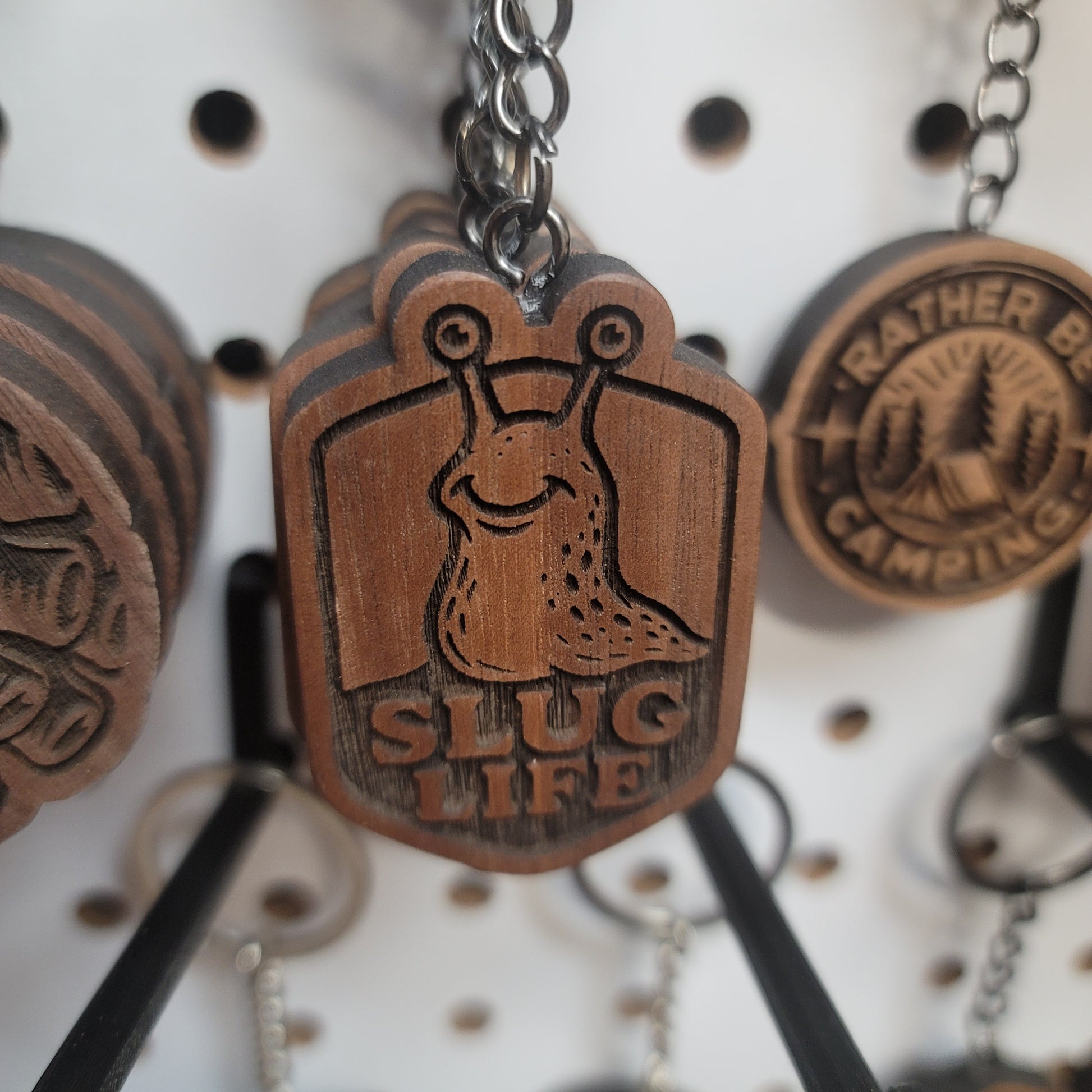 Handcrafted from solid walnut, these unique keychains are designed and made in-house on Vancouver Island. Each keychain averages 2–3 inches in size, featuring art inspired by the West Coast. Durable, lightweight, and engraved for a clean, lasting finish.