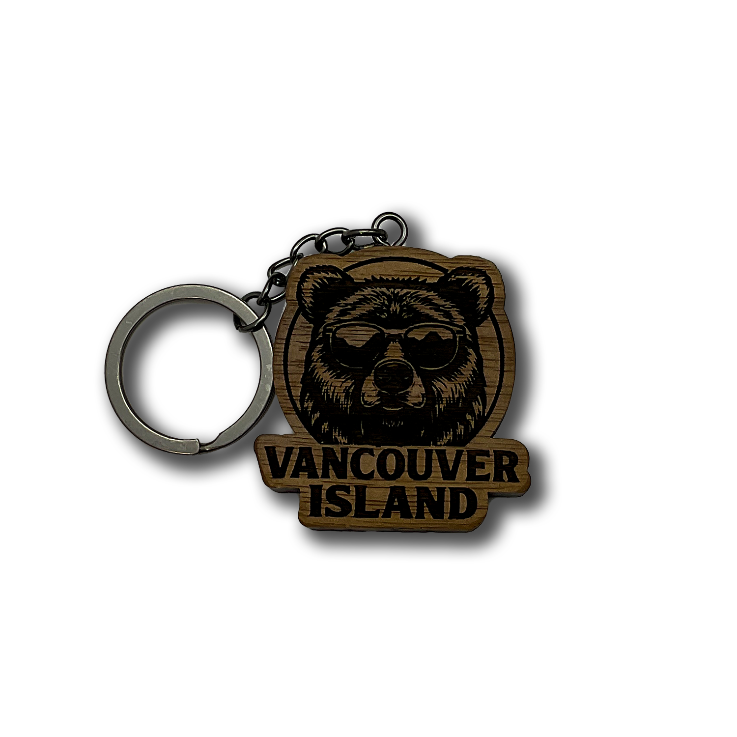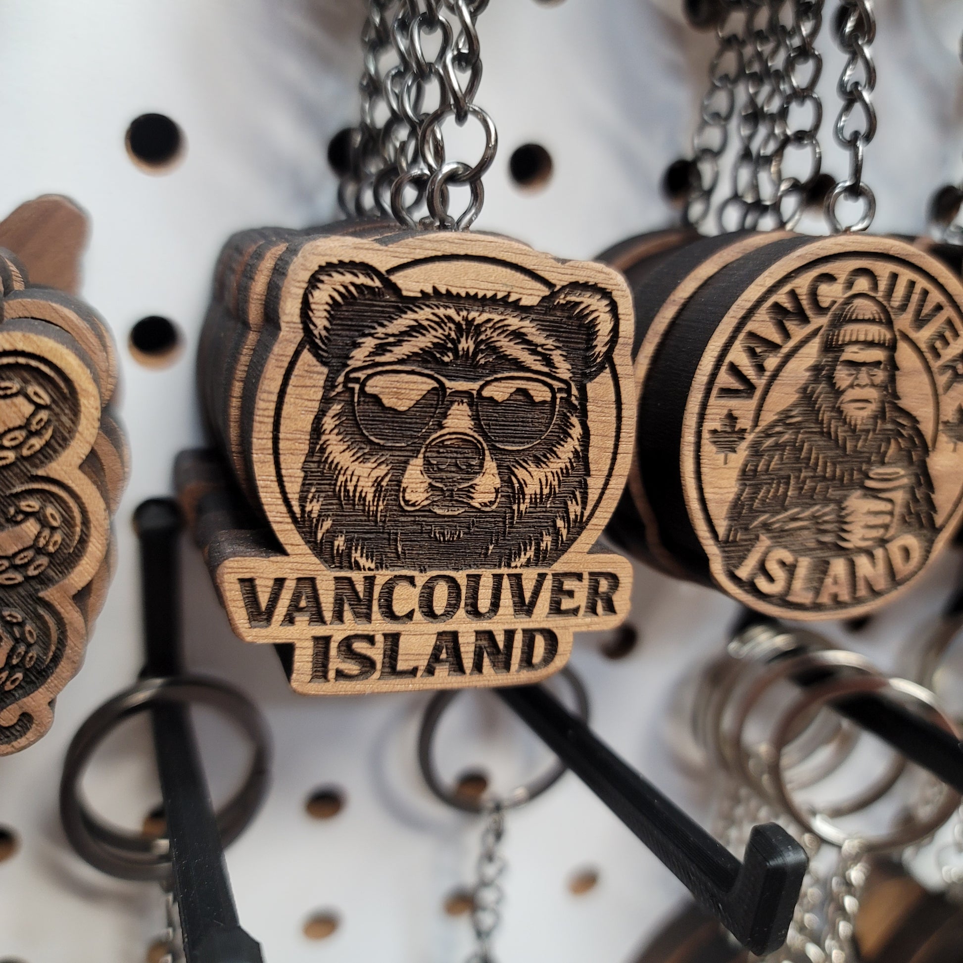 Handcrafted from solid walnut, these unique keychains are designed and made in-house on Vancouver Island. Each keychain averages 2–3 inches in size, featuring art inspired by the West Coast. Durable, lightweight, and engraved for a clean, lasting finish.