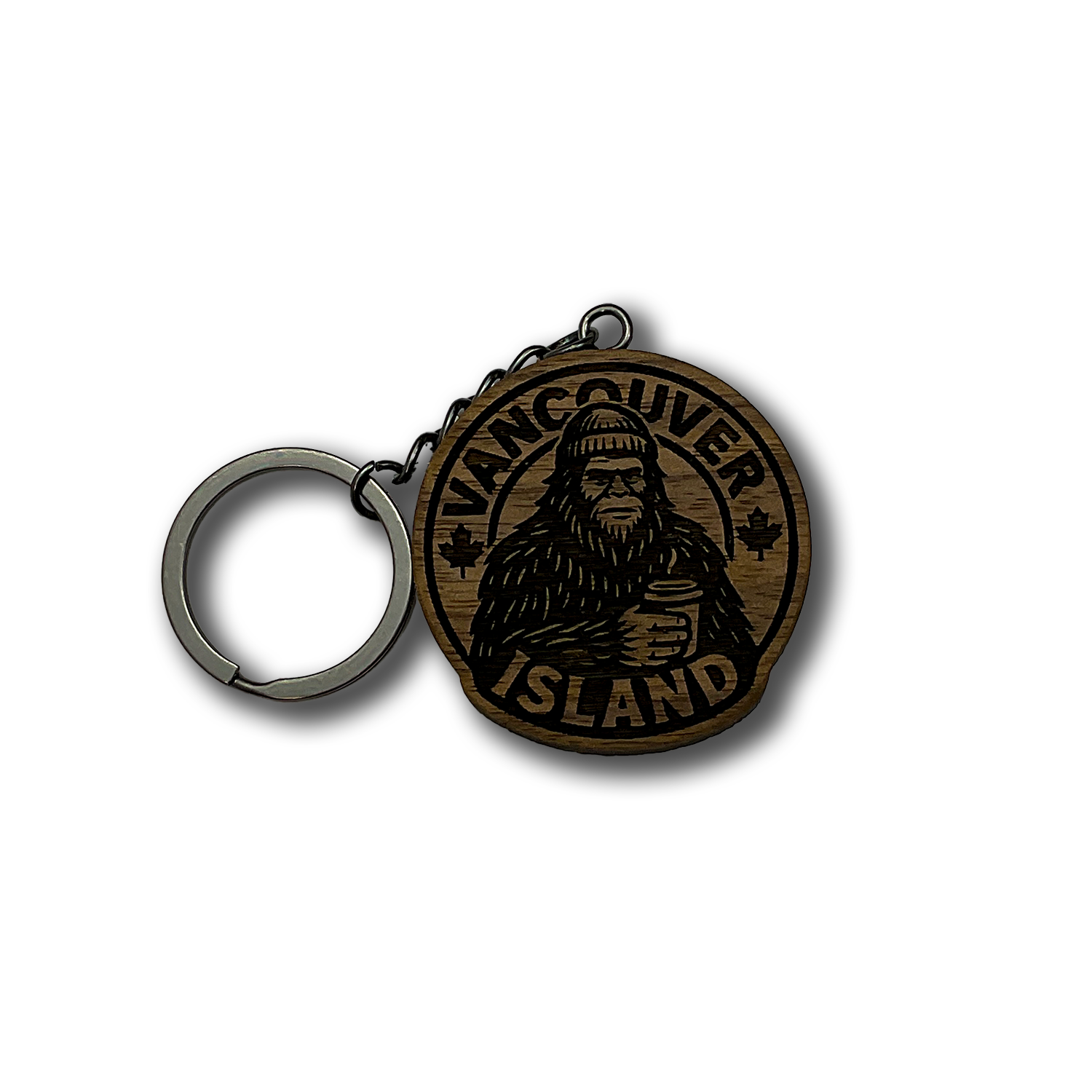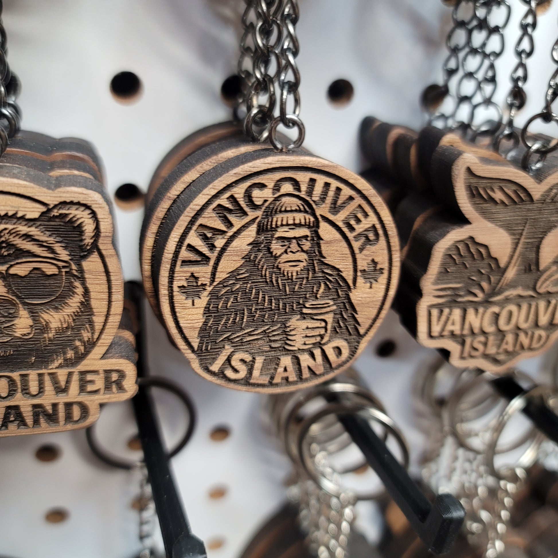 Handcrafted from solid walnut, these unique keychains are designed and made in-house on Vancouver Island. Each keychain averages 2–3 inches in size, featuring art inspired by the West Coast. Durable, lightweight, and engraved for a clean, lasting finish.