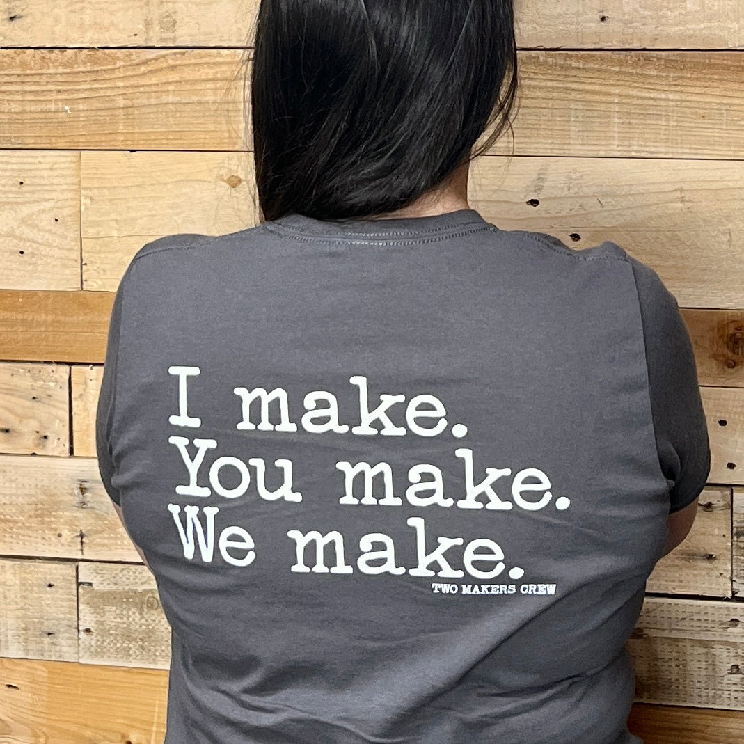 But that's not all – our shirts also carry a powerful message on the back: "I make. You Make. We make." This message speaks to the heart of our mission, celebrating the collective creativity of makers everywhere. Whether you're a solo creator, a dynamic duo, or part of a larger community, our shirts invite you to join us in celebrating the joy of making together.